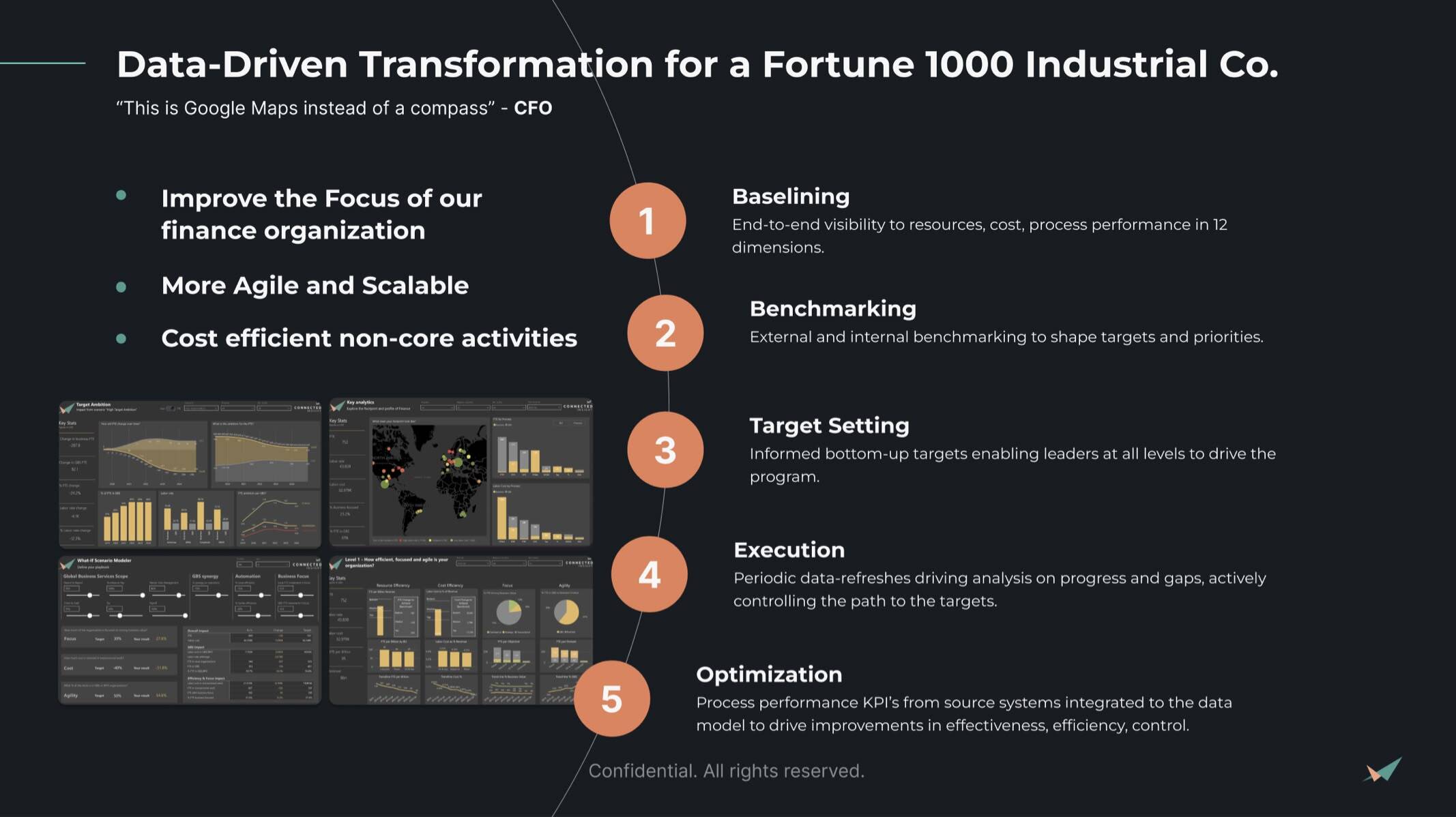 The senior leadership team of a global Fortune 1000 industrial company wanted to create a finance organization that was more focused, agile and efficient. CI's platform provided the end-to-end analytics capabilities for the lifecycle of the program: